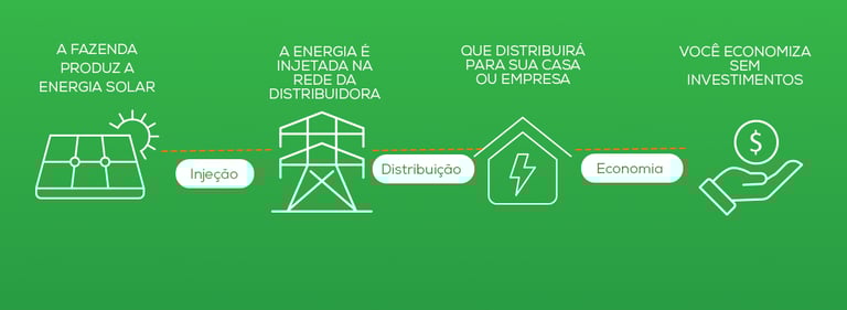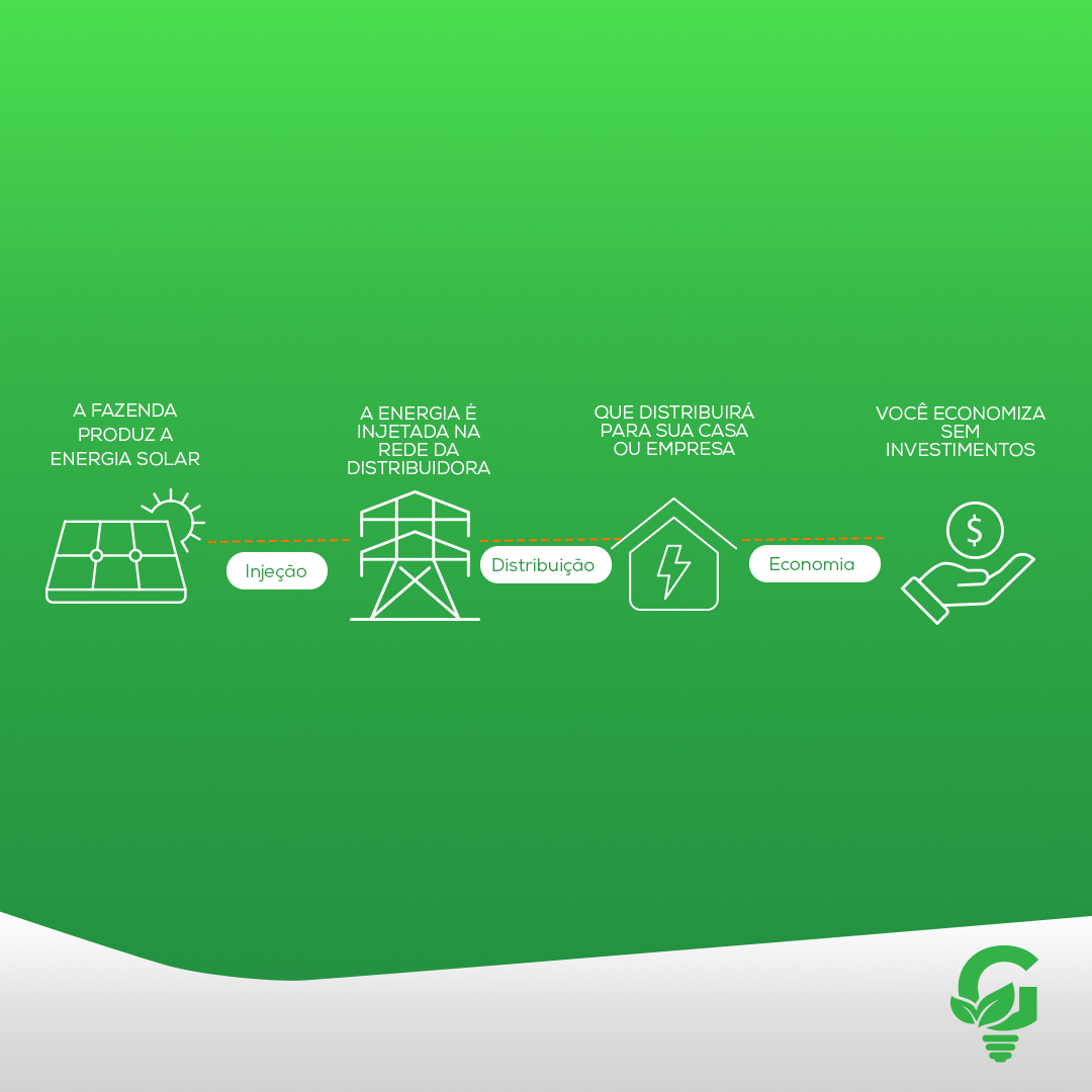 A energia é produzida em fazendas solares, injetada na rede da sua distribuidora atual (Cemig, por exemplo) que continua sendo responsável pelo seu abastecimento e compensada na sua conta de luz, gerando economia todos os meses.