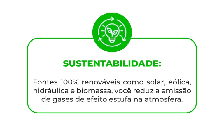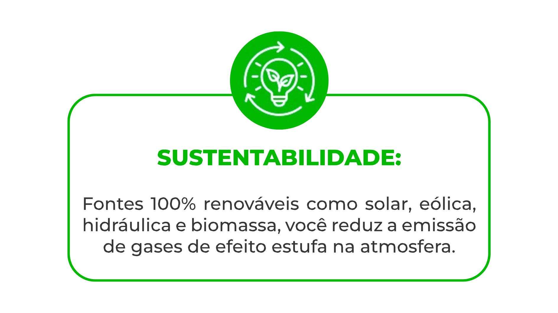 Ao migrar para o Mercado Livre de Energia, sua empresa, consumidora de média e alta tensão, passa a consumir energia proveniente de fontes 100% renováveis, como solar, eólica, hidráulica e biomassa.