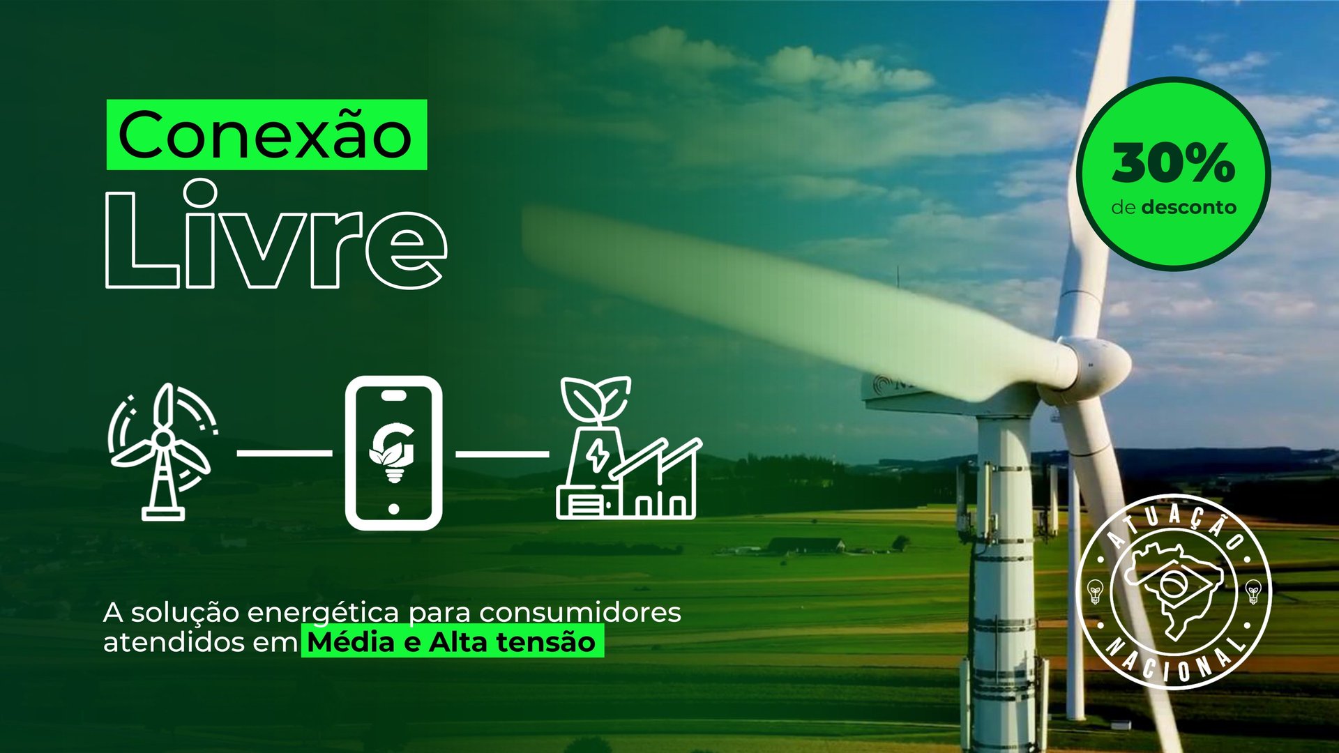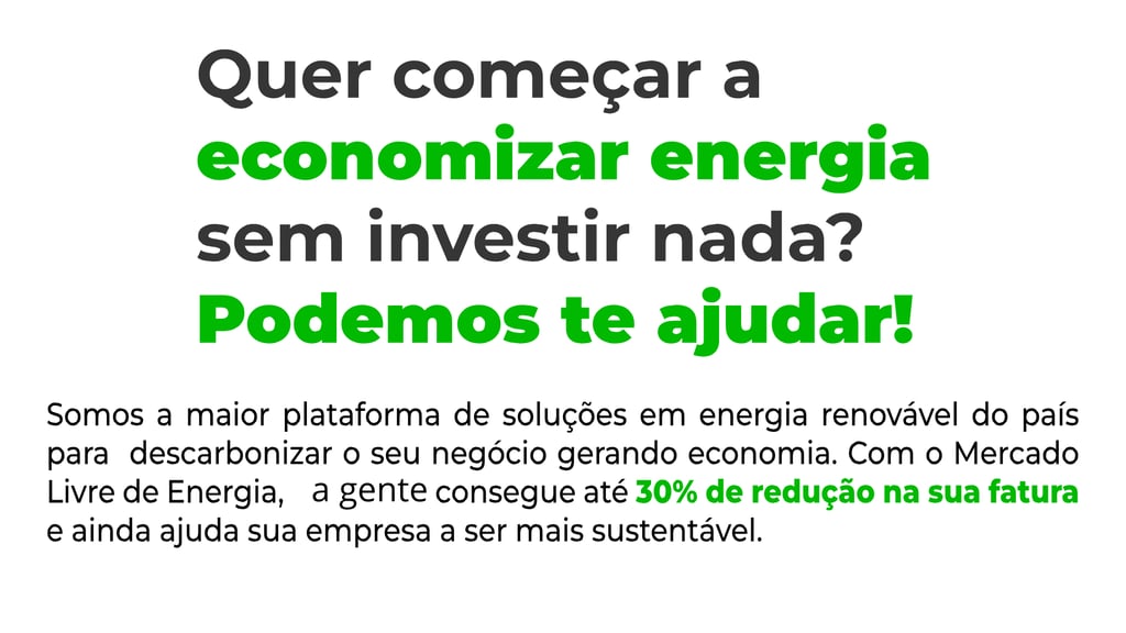 Ao migrar para o Mercado Livre de Energia, sua empresa, consumidora de média e alta tensão, passa a consumir energia proveniente de fontes 100% renováveis, como solar, eólica, hidráulica e biomassa.