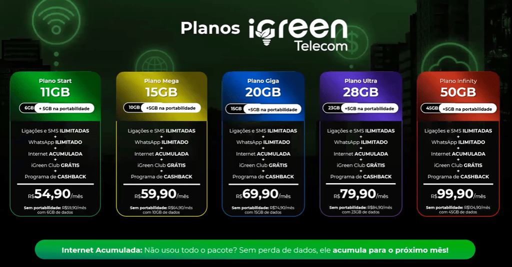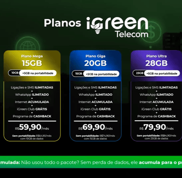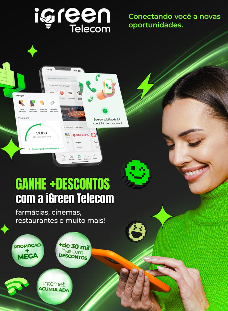 A iGreen Telecom é a solução em telefonia móvel da iGreen Energy. Com a Telecom você desfruta de planos incríveis de internet cumulativas, e ainda ganha acesso ao iGreen Club, ganhando descontos em mais de 600 mil produtos e serviços em todo o Brasil!